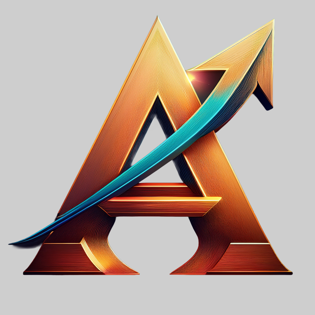 A stylized gold and brown letter 'A' with a blue upward arrow crossing through it.
